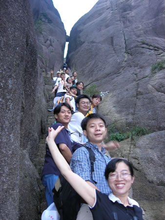 為了節省體力,大家一同坐纜車到達了玉屏峰,此峰可真是人山人海,寸步難移。圖中的松樹,既是大名鼎鼎的迎客松了。