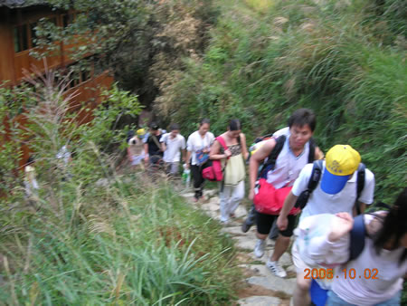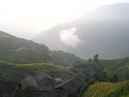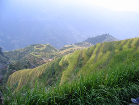 龍勝的梯田風光乃世界又一大景觀,春夏秋冬其景觀各不相異.在這金秋時節,整個梯田山上金黃的麥穗一片,形成一片浩瀚的海濤景色圖.經過4個半的車程&1個鐘的攀越,終于將龍勝梯田秋之景一覽于腳下.