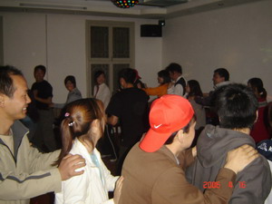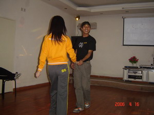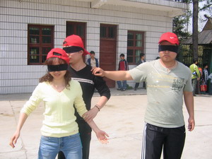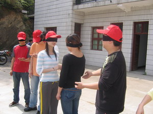 盲人摸號(每隊選出9個成員均戴上眼罩,每人一個號,此號只有本人知道。小組成員在“全盲全啞”狀態下,根據每人的號數,按從小到大的順序排列出一條直線。全盲全?那怎么溝通呀?聽起來有點兒難度哦,但武漢商科人果然聰明,雖然中間出了一點兒小差曲(有人差點兒偏離隊伍),但兩個隊均在7分鐘和8分鐘內準確的排列出順序,是一點兒不差哦。教官都說我們的成績是相當不錯呀。唉,不得不佩服我們自己呀。^-^)