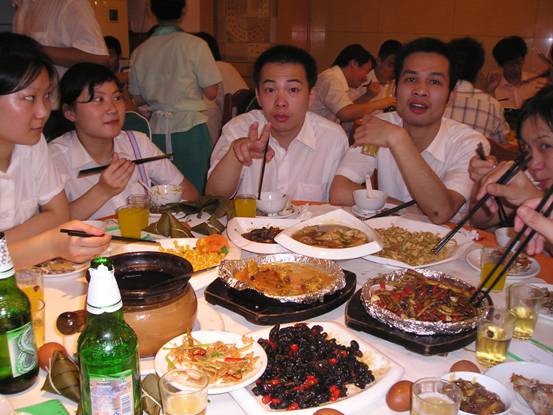 人都到齊了,怎么還沒有上菜啊?來,我們先干一杯“祝大家端午節(jié)快樂”!