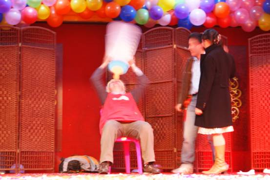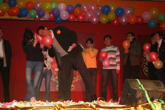 在精彩的文藝節(jié)目表演完后,是游戲時(shí)間了,首先是搞笑的頂氣球。