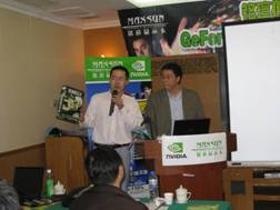 NV廣州區銷售經理楊成發表講話,楊先生用極富感染力的演講方式向經銷商家講述NV專業顯卡Quadro和NV的CUDA技術,及產品的規劃、性能特點以及市場優勢。
