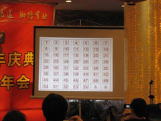 在屏幕中出現的1-54中,每個數字后面都代表中晚會在場的同事,看看誰會被選中呢?被選中的同事要參加我們準備的游戲《快樂傳真》。