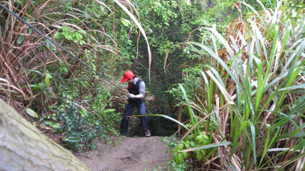 這是紀龍山有名的豹子崖,坡度有60多度,高3、40米,天上的雨稀里嘩啦,陡峭的崖壁顯得異常險滑。教練建議我們不爬的跟著助教走另外一條路,但我們整個團隊50人, 沒有一個放棄的,大家互幫互助的全部爬上了豹子崖!
