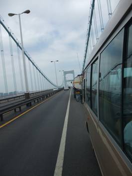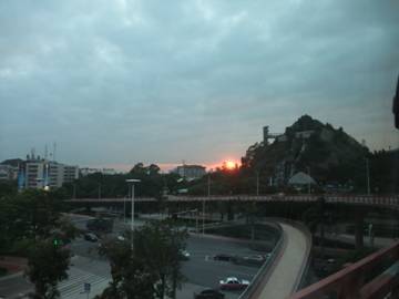 經(jīng)過整整九個多小時的長途跋涉,下午六點多,終于即將到達我們的第一站,在進入市區(qū)的時候恰巧夕陽西下,一輪紅日慢慢隱沒與橋的那一頭,又一副壯美景觀呈現(xiàn)于眼前。。