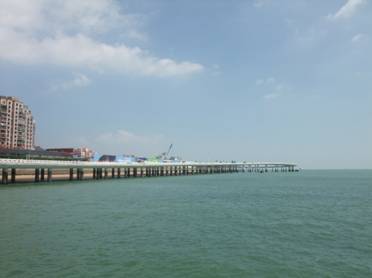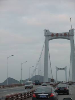 從導游宋小姐口中得知,海滄大橋乃是世界第二,亞洲第一的特大型三跨全漂浮鋼箱梁懸索橋,全長五千多米(嘿嘿,當時沒記住詳細數(shù)據(jù),查資料得知全長5926.527米,主跨648米);大橋的索塔采用門式結構,橋柱各部結構采用曲線造型為基調的設計構思,型體上線條流暢,輕柔,使大橋本身也為了一座藝術精品。 遠遠望去,銀藍色的橋體與碧藍色的天空相輝映,似長虹如玉帶般橫臥在粼粼的海面上。一條條平行鋼絲索股,掛在門式索塔上,舉目望去行駛的汽車仿佛飛翔在藍天碧海中,縱橫交錯,真是美不勝收的畫卷。