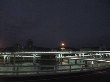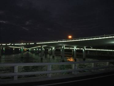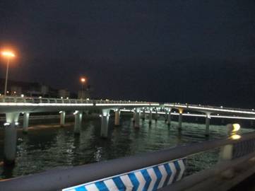 當旅行巴士進入市區(qū)行至環(huán)島路西段時,一座壯美獨特的大橋又躍然于眼前。此時,正值華燈初上,遠遠看去只見一長排橋墩呈橢圓型立于水中,空中橋身則為流暢的弧線形,橋上燈火輝煌,橋下波光蕩漾,就如同一條騰出水面的白龍,強烈地震撼著我們的視覺,原來這就是著名的“演武大橋”。