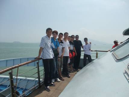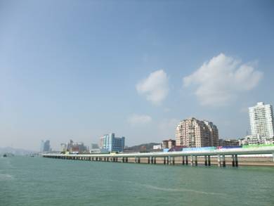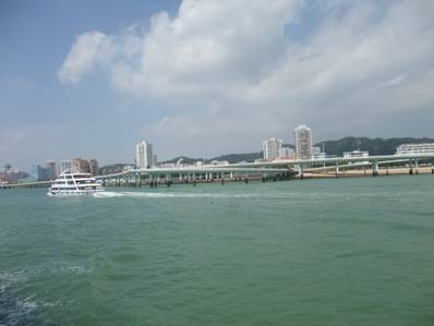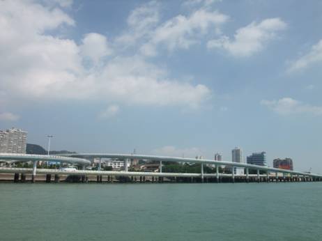 金門島游輪合影 次日,乘坐游輪環(huán)游小金門島再次經(jīng)過演武大橋,立于船頭遙望廈門市區(qū),只見大橋迎面聳立海上,與夜景絕然不同,她與岸同高, 呈S形的路段環(huán)繞著廈門大學的海景房,流線型的梁體緩緩延伸,波浪似地起伏著;遠遠看去,如長龍臥波,欲騰空而起,細看時 又似展翅飛翔的白鷺,躍出水面的白鰭豚,簡捷流暢的線條,精美靈動的造型,給人以強烈的視覺美感。