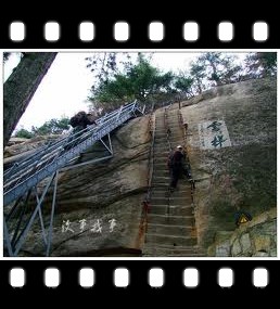大約一小時后,我跟O同學(xué)爬上金鎖關(guān),在喊我們買手電的人面前驕傲的掏出我們的裝備。前路沒了引路燈,風(fēng)險恐懼倍增,正擔(dān)心后面的團(tuán)員,O同學(xué)說“不用擔(dān)心,成年人會知道要買手電的,且路上人那么多,相互會照應(yīng)呀”。于是,再次上路,行至云梯,我們膽怯了,直立的石梯,3條鐵索,完全是沒有安全繩的純攀巖,放棄吧。幸好還有個相對容易的鐵梯,轉(zhuǎn)去鐵梯,只是有扶手的鐵梯是供人下山用的,窄梯屬單行線,只能等山上的人下完,才能上,否則必然極度危險。我倆是沒有耐性的人,等了3分鐘,又跑回石梯。抓上鐵索,蹬上石梯,沒來得及后悔,已沒了力氣,O同學(xué)看我不動了,喊我退下來。我怎甘心退下來,喊了下旁邊的帥哥,“我沒力氣了,你等等我,幫幫我”。帥哥空了一只手,扶了我一把,突然讓我有氣力調(diào)整姿勢了,原來剛才因為害怕抓緊鐵索,試圖用手臂力量征服云梯是錯誤的,既然是梯,就該用腿蹬上去,喊著“我一定要爬上去”,調(diào)整好姿勢,謝過帥哥,輕松的爬了上來,東峰頂即在眼前,云梯之上的那刻,狂喊狂喜。可低頭,莫放棄,終會獲得。
