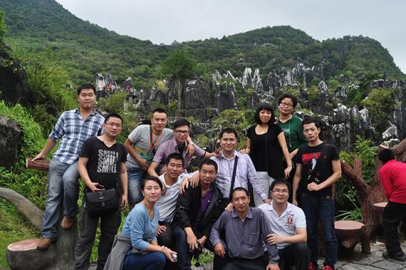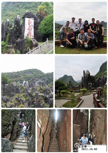 當(dāng)天下午三點多我們又來到玉石林景區(qū),它之所以叫玉石林是因為山上的石頭屬于玉白色,不同于昆明的花崗巖石林;一路行去,處處石林矗立、石芽裸露、奇峰突兀、石筍石柱狹縫密布;玉石林的小路涉及很科學(xué),在不大的景區(qū)蜿蜒穿插,交錯疊行,可以使游人充分運動,又能從不同角度去欣賞玉石林的特色;大家逢路必走,有坡必上,特別是在“一線天”,累的大汗淋漓,較上午的游姑婆山累多了。。。