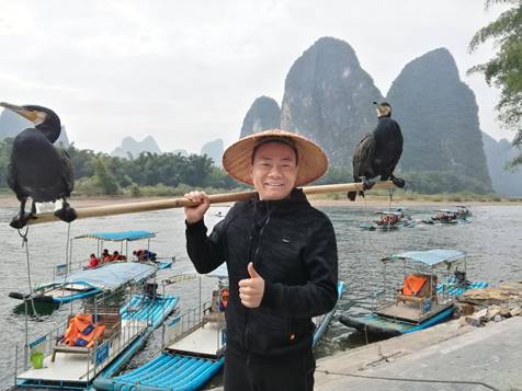游覽完漓江,在岸邊,我們的王總還客串了一回打魚翁,那兩只魚鷹是不是和王總搭起了非常和諧呢?
