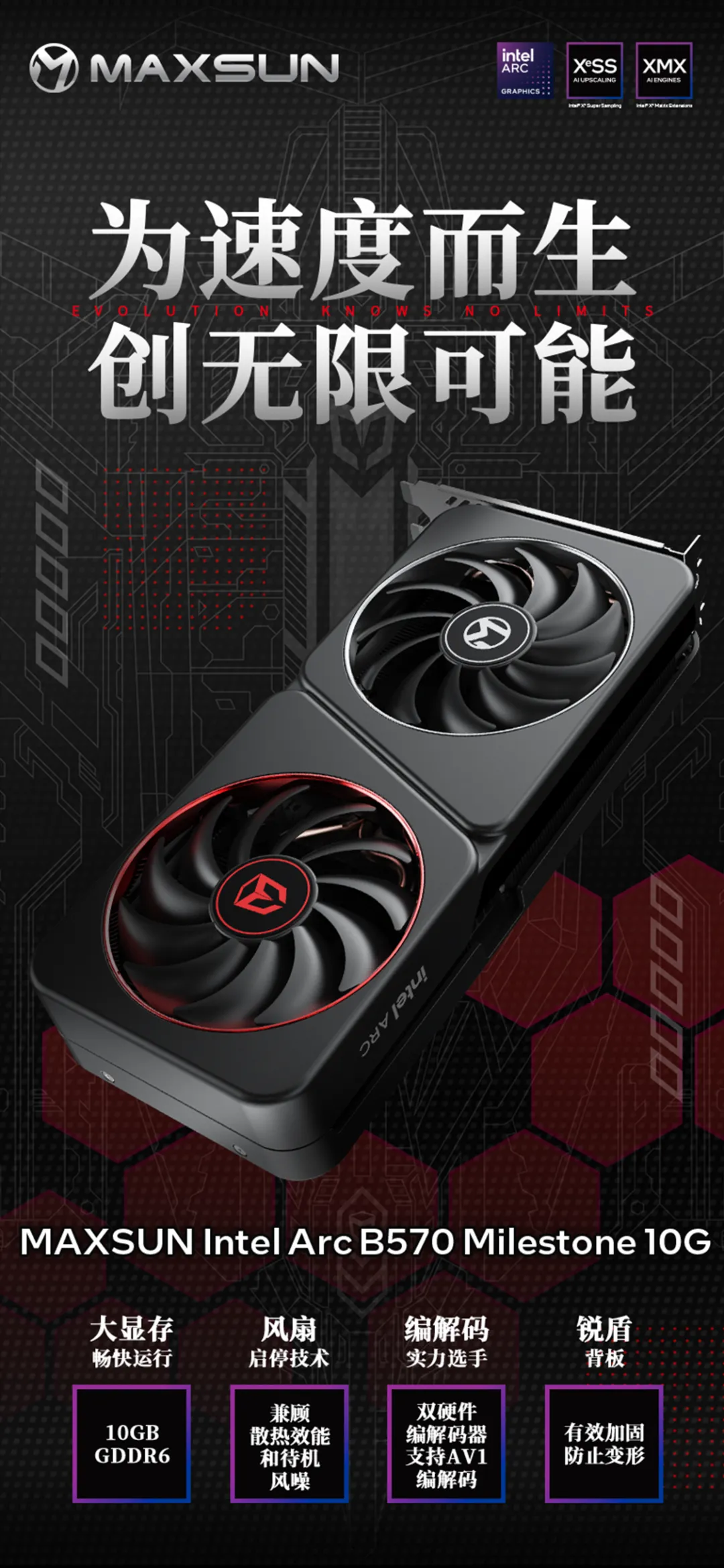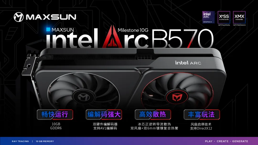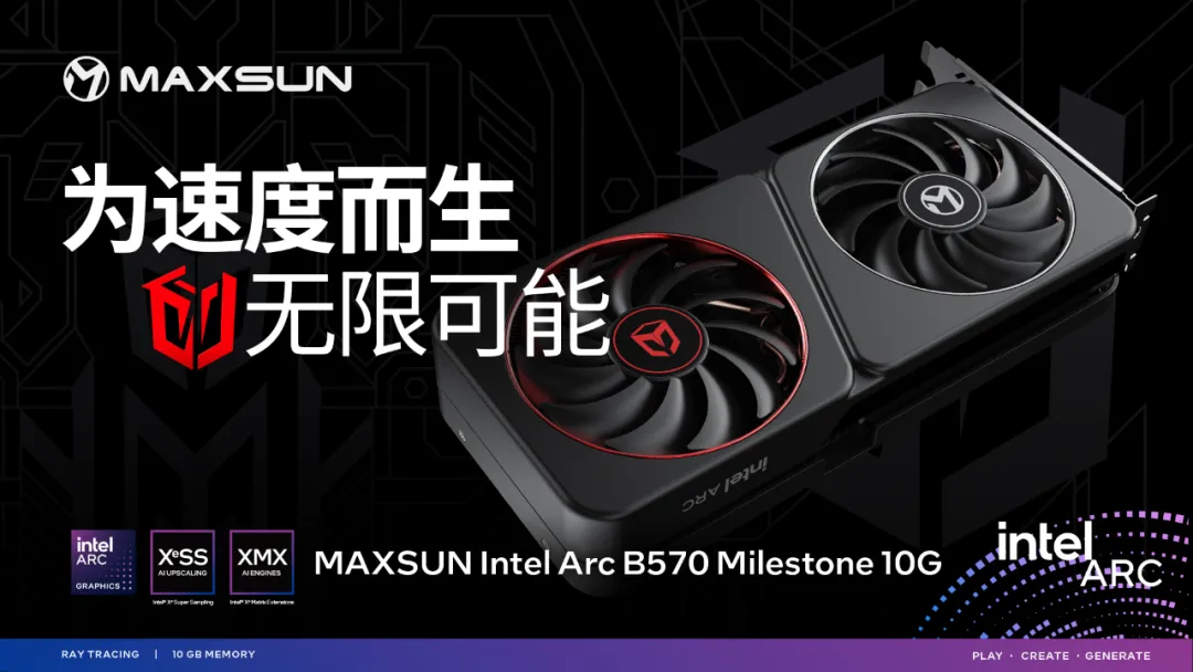 無論是追求游戲體驗的電競玩家,還是專注于內容創作的專業人士,MAXSUN Intel Arc B570 Milestone 10G都將為您帶來更豐富多彩的游戲和創作旅程,助力創意與激情的盡情釋放!