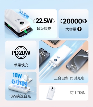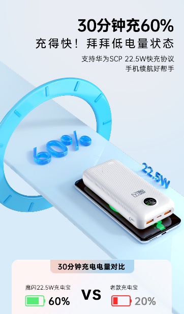 值得一提的是,魔閃20充電寶針對不同設備進行了深度優化。支持華為手機22.5W超級快充,半小時充60%的電量讓華為用戶能夠快速為設備恢復電量,大大節省了充電時間。對于蘋果15-16系列手機用戶來說,魔閃20同樣表現出色,支持PD20W快充,半小時續航50%,能夠為蘋果設備提供高效、穩定的充電體驗。