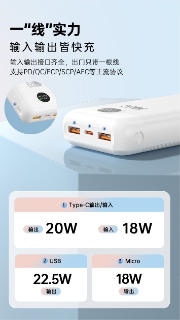 在接口設計方面,魔閃20充電寶展現了強大的兼容性和實用性。配備了2個USB接口和1個Type-C接口,能夠同時為多臺設備充電,滿足和家人、朋友的共同需求。無論是家庭聚會、朋友出行還是商務會議,魔閃20都能確保設備始終保持充足的電量。