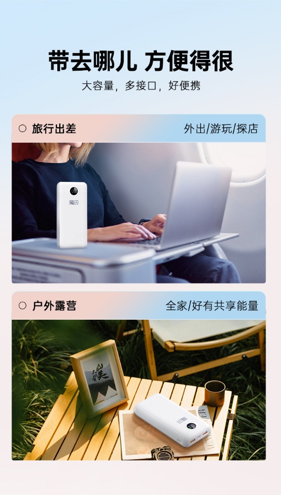 魔閃20充電寶的外觀設計同樣令人眼前一亮。采用了簡約時尚的外觀,輕巧便攜,無論是放在背包里還是口袋中,都不會給您帶來任何負擔。無論您是在機場候機、在咖啡館享受悠閑時光,還是在戶外探險,魔閃20都能完美融入您的生活場景。