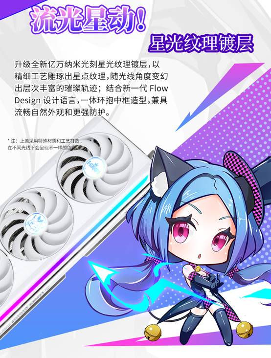 燈效方面,這款顯卡具備更大面積的側邊星河流光燈條,光影交織,構建多維光效矩陣,支持ARGB燈光同步,璦珈RGB合金背板創新加入夢幻撞色燈效,層疊幻彩光影,為玩家延展出更沉浸的空間。