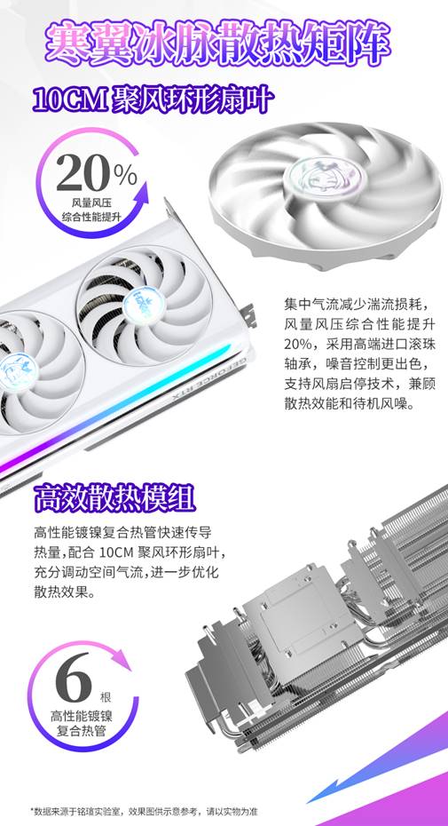 為了應對高性能帶來的熱量,該卡在散熱效能上也進行了升級,采用3*10CM聚風環形扇葉,集中氣流減少湍流損耗,采用高端進口滾珠軸承,噪音控制更出色,支持風扇啟停技術,兼顧散熱效能和待機風噪。高效散熱模組快速傳導熱量,進一步優化散熱效果。