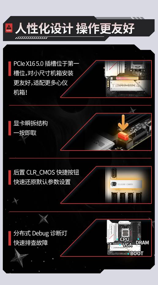 除了強(qiáng)悍的性能,銘瑄Terminator B850M PRO WIFI主板還加入了許多貼心設(shè)計(jì),如顯卡瞬拆結(jié)構(gòu),裝機(jī)維護(hù)時無需費(fèi)力拆卸螺絲;分布式Debug診斷燈能快速定位故障,小白也能輕松排查問題;CLR_CMOS快捷按鈕,讓設(shè)置重置更便捷,全程省心省力,裝機(jī)體驗(yàn)直接拉滿。