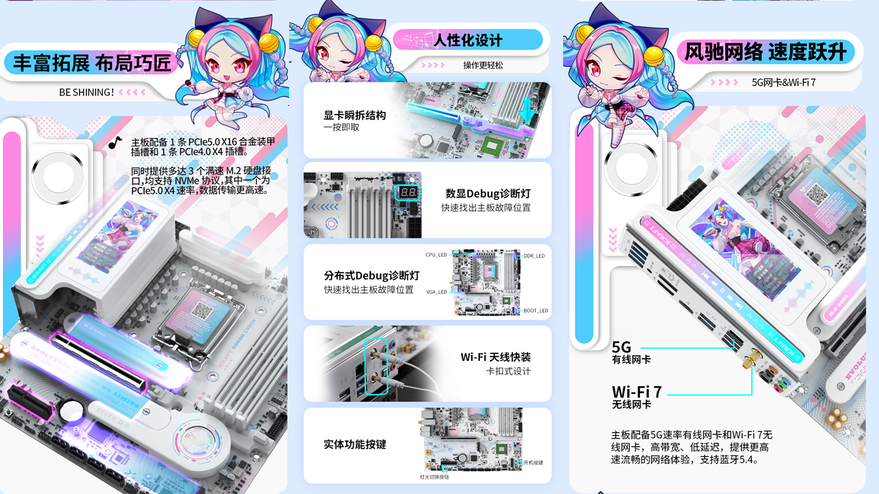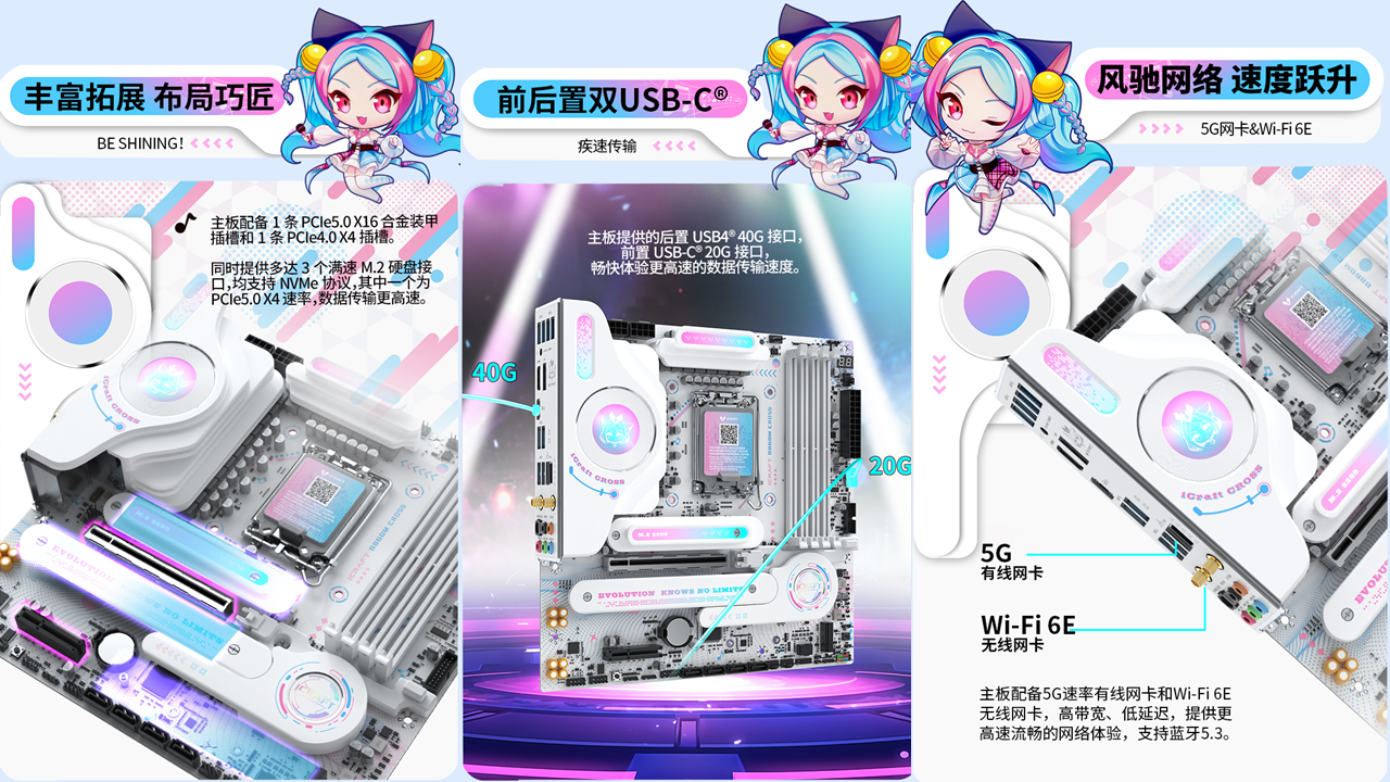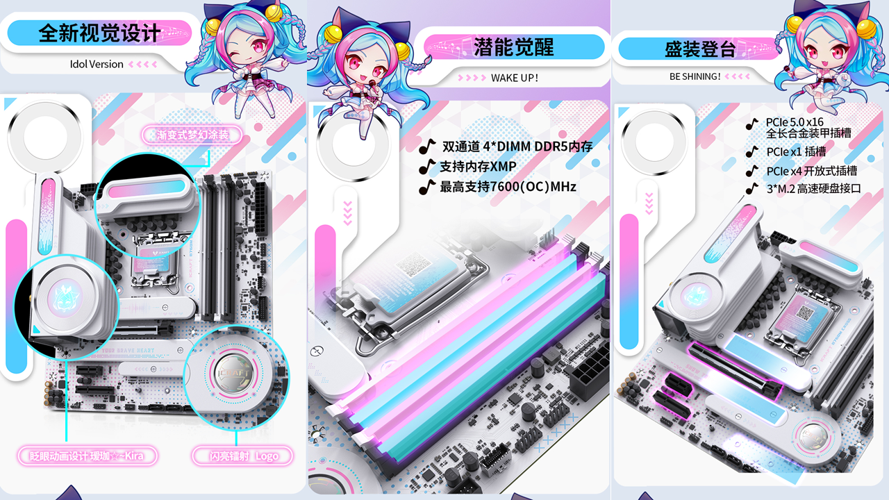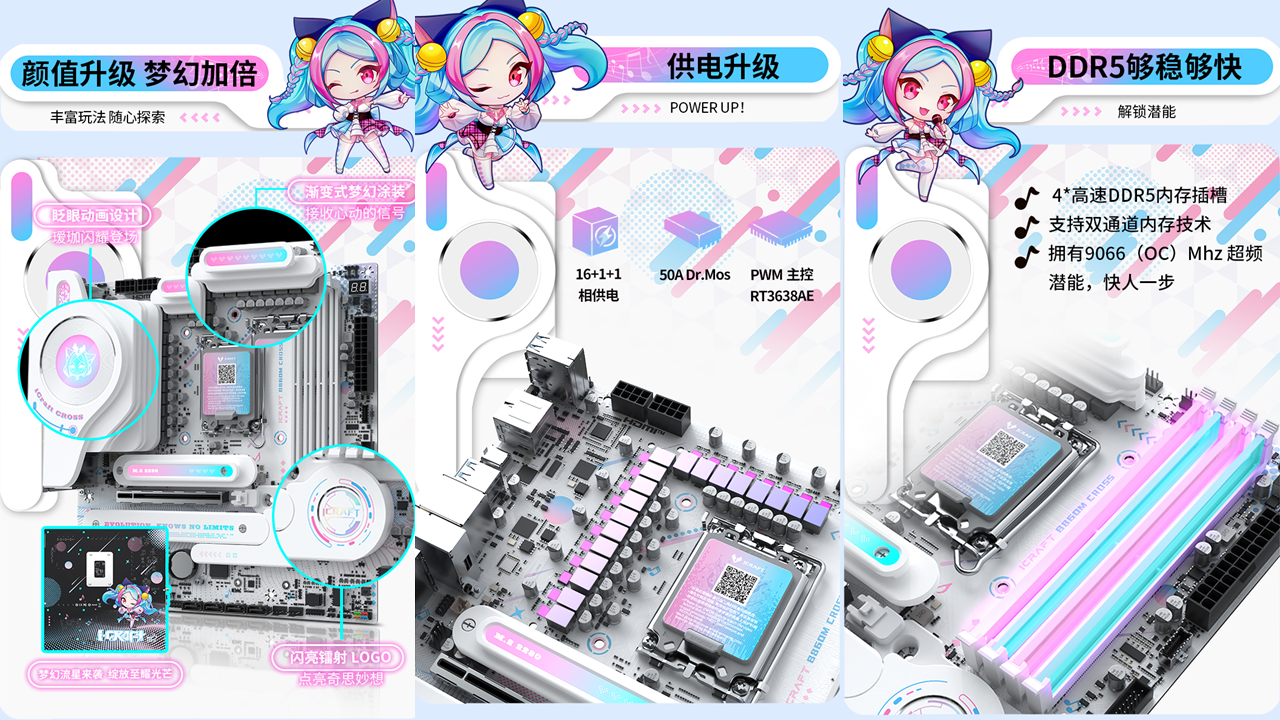 銘瑄iCraft B760M CROSS主板,外觀上粉藍配色,主板上的吉他裝甲以及多處的漸變設(shè)計點綴,加上全白的PCB和大面積的個性裝甲,吸睛度拉滿。值得一提的是主板上的創(chuàng)新式LED小屏幕,通電后可以發(fā)現(xiàn)這里是一個會眨眼的Q版璦珈,通過BIOS設(shè)置還能調(diào)節(jié)小璦珈的不同5種不同動作狀態(tài),給整個DIY主機注入了新的活力。除了出眾顏值,性能同樣不容小覷。供電方面,主板采用了12+1+1相的供電設(shè)計,核心供電都是50A Dr.Mos,備4條雙通道DIMM的DDR5內(nèi)存插槽,優(yōu)化的線路布局,讓它擁有優(yōu)秀的超頻能力,支持內(nèi)存XMP,最高可至7600MHz。還搭配了一條PCIE5.0 X16全長合金裝甲插槽、一條PCIex1 插槽、和一條PCIe x4開放式插槽,存儲方面主板搭載3個M.2硬盤接口、4個6G SATA接口,無論是外接設(shè)備還是擴容存儲,都能輕松滿足,適配宅家多樣化使用需求。