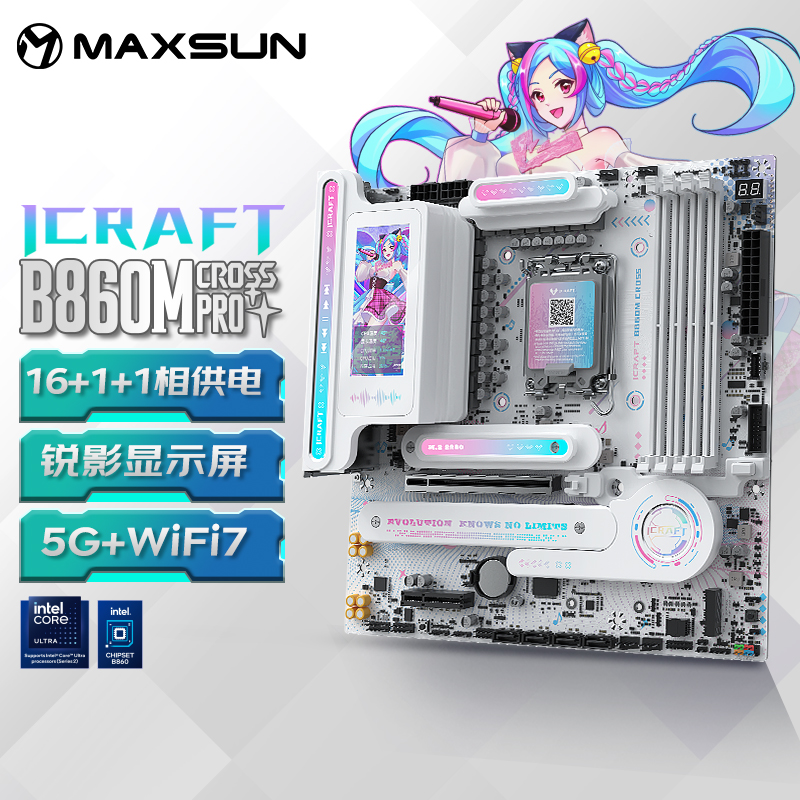 銘瑄iCraft B860M CROSS PRO璦珈主板,作為顏值旗艦,全面支持銘瑄全新的PTM UI BIOS,操作更便捷。吸睛亮點則是充滿細節(jié)的個性化屏幕,全新配備銘瑄銳影屏,3.4英寸銳影LED顯示屏支持多種模式設(shè)置,除了可實時顯示系統(tǒng)信息、個性化開關(guān)機畫面外,還可開啟桌面映射,同步顯示專屬畫面或影像,通過銳影屏配套軟件MAXSUN View,探索無限自定義玩法。全面支持銘瑄全新的PTM UI BIOS,性能實力自然也是高水平,供電升級,采用16+1+1相供電設(shè)計,核心供電50A Dr.Mos,輕松駕馭英特爾® 酷睿™ Ultra 9 處理器 285K;配備前后置雙USB-C®,后置USB4® 40G接口,支持最高40Gbps傳輸速率,數(shù)據(jù)傳輸更高速。