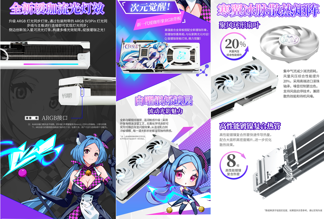 銘瑄GeForce RTX 5080 iCraft OC16G璦珈顯卡,升級 ARGB 燈光同步燈效,通過包裝附帶的ARGB 5V3Pin 燈光同步線與主板進行連接即可實現(xiàn)燈光同步;側(cè)邊創(chuàng)新加入星河流光燈條,構(gòu)建多維光效矩陣,綻放璦珈之光! 高強度合金背板搭配全新璦珈形象,雙璦珈驚喜亮相,與玩家跨次元對話!Q版璦珈背板燈效,萌力覺醒! 性能上,依托Blackwell 架構(gòu)滿血核心與 16GB GDDR7 顯存,運行《戰(zhàn)地 6》4K 高畫質(zhì)并開啟光線追蹤與 DLSS 4 超分辨率模式時,遠景植被、遠處建筑紋理清晰可見,夜間作戰(zhàn)時的手電筒光斑、爆炸火光等動態(tài)光影效果無拖影;支持 NVIDIA Reflex 低延遲技術(shù),鼠標(biāo)操作響應(yīng)速度提升顯著,近距離剛槍時瞄準(zhǔn)更準(zhǔn)確,再也不會因延遲錯失爆頭機會,助你在跨年戰(zhàn)場中所向披靡。