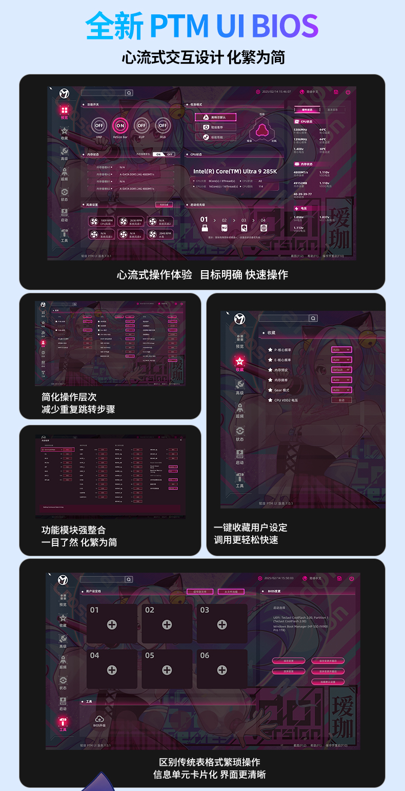 銘瑄iCraft B860M CROSS璦珈主板則為這份體驗提供了堅實支撐,采用新一代芯片組,相比 B760 主板性能進一步提升,全面支持銘瑄全新的PTM UI BIOS,操作更便捷。主板配備LED小屏幕,通電后會呈現(xiàn)活力滿滿的小璦珈眨眼動畫,魅力滿分!對比上一代,供電升級采用16+1+1相供電設(shè)計,核心供電50A Dr.Mos,輕松駕馭英特爾® 酷睿™ Ultra 9 處理器 285K;配備前后置雙USB-C®,后置USB4® 40G接口,支持最高40Gbps傳輸速率,數(shù)據(jù)傳輸更高速。并配備4條雙通道DIMM的DDR5內(nèi)存插槽,優(yōu)化線路布局,超頻能力更強,具備9066(OC)Mhz超頻潛能,盡情釋放偶像實力。