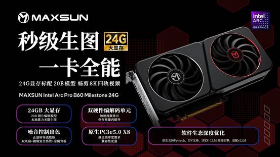 無論是追求秒級生圖、流暢剪輯的內容創作者,還是追求更強悍AI性能、需要搭建多卡同步運算環境的高階算力用戶,銘瑄 Intel Arc Pro B60系列顯卡都提供了值得信賴的解決方案。24G版本的MAXSUN Intel Arc Pro B60 Milestone 24G顯卡以高性價比助力靈感實時落地,雙GPU 48G版本的MAXSUN Intel Arc Pro B60 Dual 48G Turbo則以雙芯充沛算力勝任更高階的AI推理與開發任務。想要體驗全新流暢創作之旅,或構建本地AI算力平臺的用戶,歡迎前往銘瑄京東自營旗艦店了解更多詳情與選購!