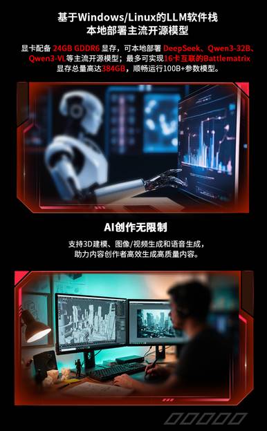 在專業剪輯方面,MAXSUN Intel Arc Pro B60 Milestone 24G顯卡同樣是“高效創作利器”。憑借強大的雙硬件編解碼單元與高帶寬顯存,顯卡能夠輕松駕馭8K分辨率、四軌道的高碼率視頻素材,實現時間線上的流暢預覽與快速導出。在DaVinci Resolve、Adobe Premiere Pro這類專業視頻制作軟件中,均能流暢預覽和處理H.265 422 10Bit的專業格式內容,顯著減少渲染與導出等待時間,為視頻創作者帶來全鏈路流暢、穩定高效的專業體驗。除此之外,顯卡的24GB大顯存更開辟了廣闊的AI推理舞臺。該卡支持在本地部署運行如DeepSeek、Qwen3-32B、Qwen3-VL等主流開源模型,并能通過多卡互聯技術,拓展至最高384GB的顯存總量,流暢運行100B+參數模型,為構建個人或團隊專屬的AI知識庫與助手,提供了更具性價比的選擇。