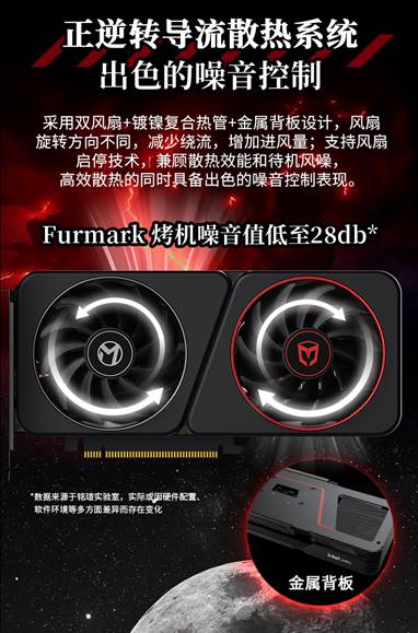 在散熱與靜音方面,該卡采用了正逆轉導流散熱系統,配備雙風扇、鍍鎳復合熱管與金屬背板,在確保高性能持久釋放的同時,將運行噪音控制在低水平,讓創作過程更專注。