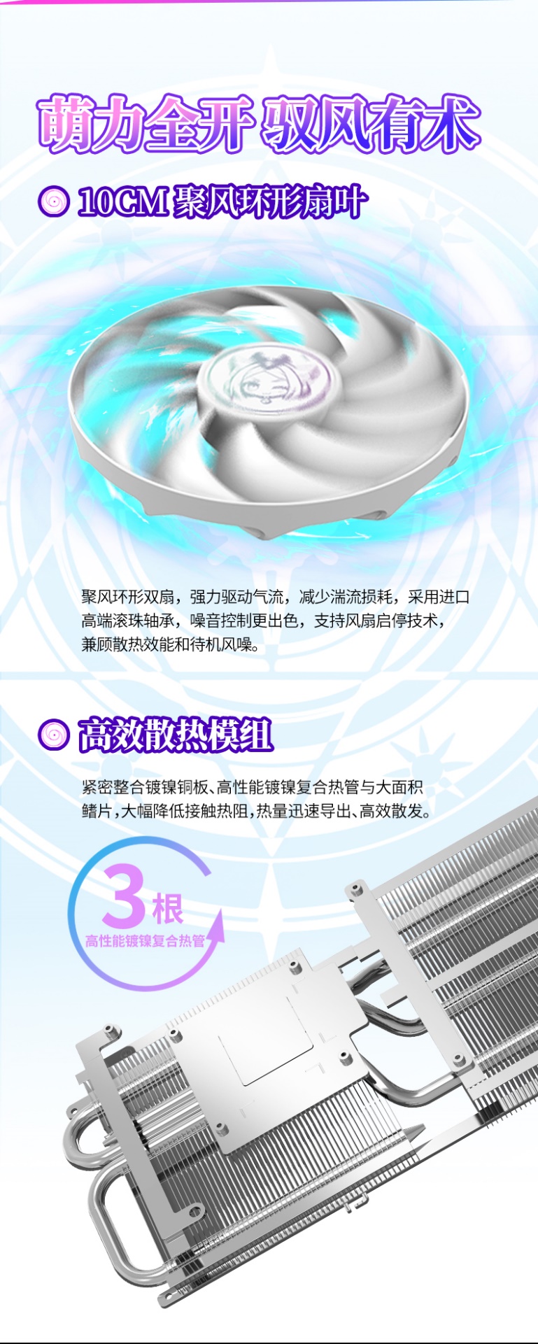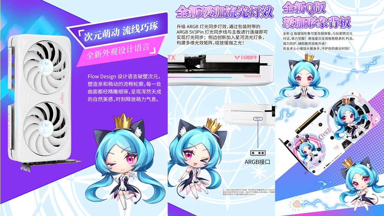 不止性能能打,這款顯卡的顏值更是戳中玩家的審美。它延續了璦珈系列標志性的溫潤白色外觀,采用 Flow Design 設計語言,每一處曲面都經過精雕細琢,流暢的線條勾勒出親和萌動的輪廓,放在主機里就像一件精致的潮玩擺件。側邊的璦珈流光燈效更是點睛之筆,炫彩的 ARGB 燈條支持燈光同步,你可以隨心切換燈光顏色和模式,讓顯卡和主機其他配件完美呼應,氛圍感直接拉滿。背板上的全新 Q 版璦珈形象更是萌力爆棚,煉金術士小璦珈仿佛在跨次元守護你的游戲時光。這塊高強度合金背板可不只是好看,它還能穩穩承托 PCB 板,有效防止顯卡變形,同時輔助散熱,顏值與實用兩手抓。