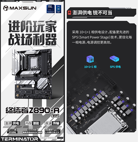 作為這套組合的“性能基石”,銘瑄Terminator Z890-A WIFI主板繼承了終結(jié)者系列的經(jīng)典配色,采用黑色 PCB 與銀色裝甲的搭配,整體風(fēng)格沉穩(wěn)大氣又不失電競(jìng)范兒。相較于上一代產(chǎn)品,在性能和外觀上都得到了全面升級(jí)。這款主板采用了10 + 1 + 1相供電設(shè)計(jì),配備更先進(jìn)的SPS(Smart Power Stage)技術(shù),更佳化每一相電源,電源調(diào)控更高效、更穩(wěn)定。即使在英特爾酷睿 Ultra 7 265K 處理器滿負(fù)荷運(yùn)行場(chǎng)景下,也能持續(xù)提供穩(wěn)定且強(qiáng)勁的電力支持,為 3A 游戲的高幀率運(yùn)行、多任務(wù)的流暢處理筑牢動(dòng)力根基。