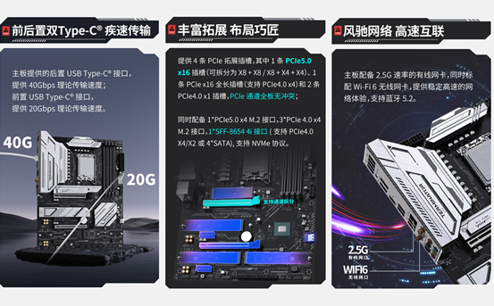 在拓展性方面,該主板展現(xiàn)出了強(qiáng)大的兼容性和實(shí)用性,能夠滿足玩家多樣化的硬件拓展需求。主板提供 4 條 PCle 拓展插槽,其中 1 條 PCle5.0 x16 插槽(可拆分為 X8+X8/X8+X4+X4)、1 條 PCle x16 全長(zhǎng)插槽(支持 PCle4.0 x4)和 2 條 PCle4.0 x1 插槽,全板 PCle 通道無沖突。存儲(chǔ)接口方面,主板配備 1 個(gè) PCle5.0 x4 M.2 接口、3 個(gè) PCle4.0 x4 M.2 接口以及 1 個(gè) SFF-8654 4i 接口(支持 PCle4.0 X4/X2 或 4*SATA),且均支持 NVMe 協(xié)議。此外,主板還配備前后置雙 Type-C 接口,后置 USB Type-C 接口理論傳輸速度可達(dá) 40Gbps,前置 USB Type-C 接口理論傳輸速度為 20Gbps,輕松實(shí)現(xiàn)疾速傳輸,滿足玩家的高效數(shù)據(jù)交互需求。網(wǎng)絡(luò)體驗(yàn)也不拉胯,主板配備 2.5G 速率有線網(wǎng)卡和 Wi-Fi 6 無線網(wǎng)卡,同時(shí)支持藍(lán)牙 5.2,有線、無線雙模式自由選擇,無需額外升級(jí)。不管是游戲?qū)?zhàn)時(shí)的低延遲需求,還是遠(yuǎn)程辦公的穩(wěn)定連接要求,都能輕松應(yīng)對(duì)。