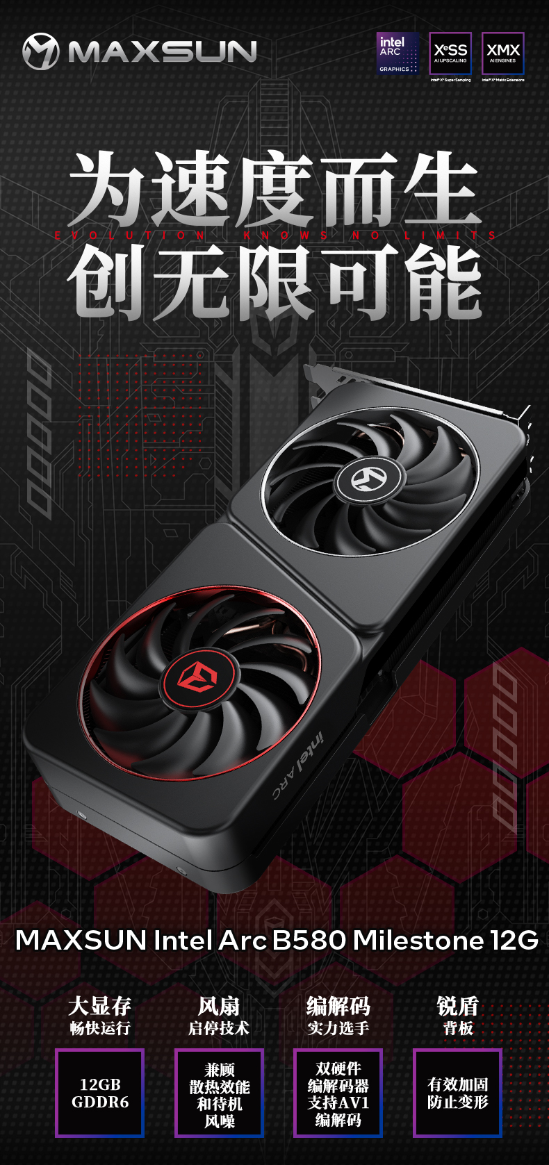 如果說處理器與主板決定了主機(jī)的基礎(chǔ)性能,那么顯卡就是暢玩3A游戲大作的關(guān)鍵。MAXSUN Intel Arc B580 Milestone 12G 顯卡,不僅擁有強(qiáng)悍的圖形性能,還在外觀設(shè)計(jì)與散熱表現(xiàn)上精心打磨,并且支持英特爾即將上線的XeSS 3多幀生成技術(shù),實(shí)現(xiàn)幀率跨越式提升,高度適配緊湊型主機(jī)的使用需求。