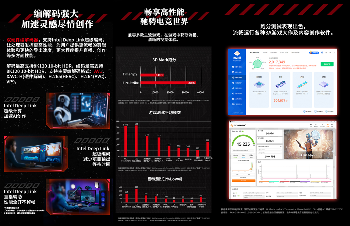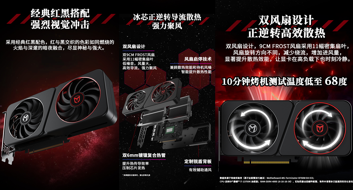 這款顯卡外觀設(shè)計(jì)上經(jīng)典紅黑配色很具視覺沖擊力,紅與黑交織如同火焰撞入暗夜,神秘又霸氣,放在桌面就是顏值擔(dān)當(dāng)。核心性能更是硬核,20 個(gè) Xe 內(nèi)核搭配 2850MHz 超高加速頻率,無論是 3A 游戲的高負(fù)載場(chǎng)景,還是專業(yè)創(chuàng)作的算力需求,都能流暢響應(yīng);12GB GDDR6 大顯存 + 456GB/S 高速帶寬,數(shù)據(jù)傳輸無瓶頸,復(fù)雜多任務(wù)處理也游刃有余。散熱與實(shí)用功能雙在線:雙 9CM FROST 正逆轉(zhuǎn)風(fēng)扇搭配 11 幅密集扇葉,減少繞流、提升進(jìn)風(fēng)量,配合雙 6mm 鍍鎳復(fù)合熱管與定制銳盾背板,10 分鐘烤機(jī)溫度低至 68℃,高負(fù)載下也能冷靜運(yùn)行;支持風(fēng)扇啟停技術(shù),兼顧散熱效能與待機(jī)靜音。接口配置豐富實(shí)用,3 個(gè) DP2.1+1 個(gè) HDMI2.1a 接口,多屏顯示、超高清影音、高分辨率游戲需求全覆蓋,還搭載雙硬件編解碼器,支持 AV1 格式與 Intel Deep Link 超級(jí)編碼,讓直播推流更順暢,視頻剪輯導(dǎo)出速度大幅提升,創(chuàng)作效率直接翻倍。