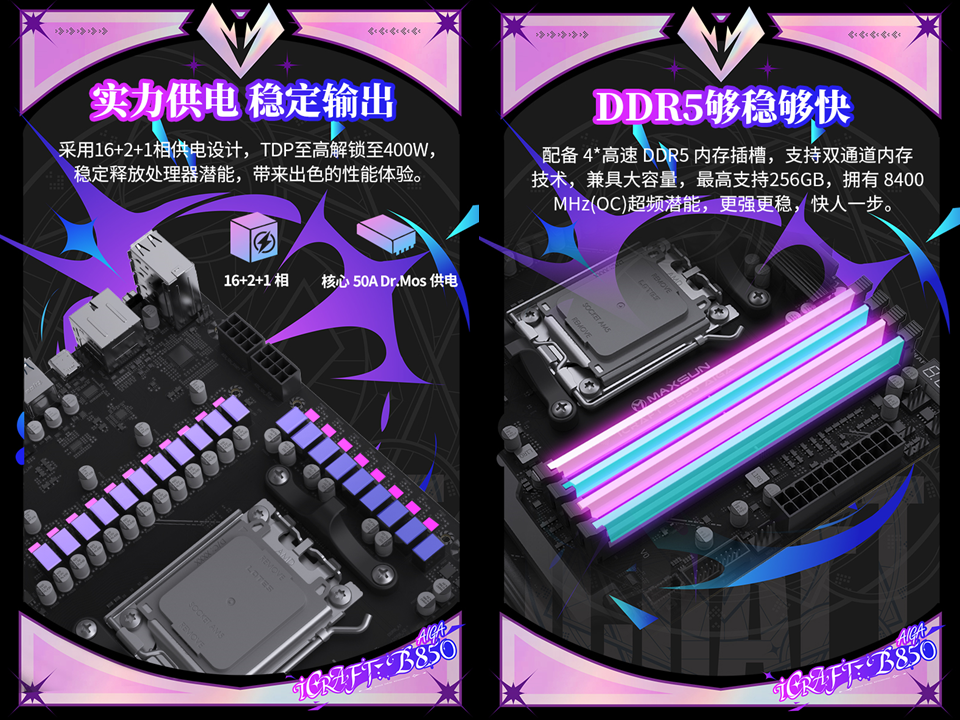 性能釋放方面,銘瑄iCraft B850 AIGA主板給出了旗艦級的硬核配置,能充分釋放AMD銳龍 7 9700X處理器的強悍性能。16+2+1 相供電設計搭配高效的核心 50A Dr.Mos,如同為處理器搭建了一座穩定的 “電力堡壘”, TDP至高解鎖至 400W,能為處理器提供持續穩定的電力輸出,確保性能拉滿。內存拓展同樣拉滿,4 條高速 DDR5 內存插槽支持高達 8400MHz(OC)的超頻頻率,無論是多任務切換、大型游戲加載,還是復雜內容創作,都能迅速響應,操作絲滑到底,告別卡頓困擾,學習效率和游戲體驗雙重提升。