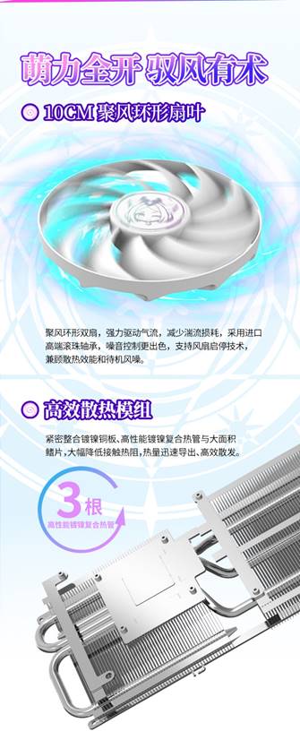這款顯卡配備了10CM聚風環(huán)形扇葉,能集中氣流減少湍流損耗,采用進口高端滾珠軸承,噪音控制更出色,還支持風扇啟停技術(shù),兼顧散熱效能和待機風噪。高效散熱模組緊密整合鍍鎳銅板、高性能鍍鎳復(fù)合熱管與大面積鰭片,大幅降低接觸熱阻,讓熱量迅速導(dǎo)出、高效散發(fā),為穩(wěn)定運行保駕護航。