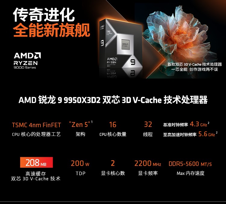 4月22日,AMD 銳龍9 9950X3D2處理器重磅開售。作為搭載雙芯 3D V-Cache 技術的旗艦處理器,它基于 TSMC 4nm FinFET 工藝與 Zen 5 架構打造,16 核 32 線程規格,加速頻率可達 5.6GHz。其最大特點是在兩個核心復合芯片(CCD)上均堆疊了3D V-Cache,使得三級緩存(L3)總容量達到192MB,加上16MB的二級緩存(L2),總緩存高達 208MB,游戲幀率與創作效率雙重拉滿,實現“一芯全能,創作游戲兩不誤” 的越級體驗,堪稱新一代 “全能 U 皇”。