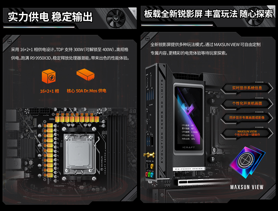 要想充分釋放AMD 銳龍9 9950X3D2處理器的強悍性能,穩定充沛的供電是關鍵。銘瑄 iCraft X870M 主板搭載 16+2+1 相核心 50A Dr.Mos 豪華供電,可將 TDP 穩定解鎖至 400W,如同為處理器鋪設一條電力高速通道,無論是高負載渲染、4K 視頻導出,還是長時間運行 3A 游戲,都能持續穩定輸出性能,不掉幀不卡頓。主板還板載了銳影LED顯示屏,不僅能實時顯示CPU溫度、內存頻率等系統信息,讓玩家隨時掌握硬件狀態,還能自定義開關機畫面,甚至支持桌面映射,同步展示專屬壁紙或游戲畫面。搭配配套軟件MAXSUN View,玩家可以盡情解鎖無限自定義玩法,讓主板成為主機的 “個性門面”。