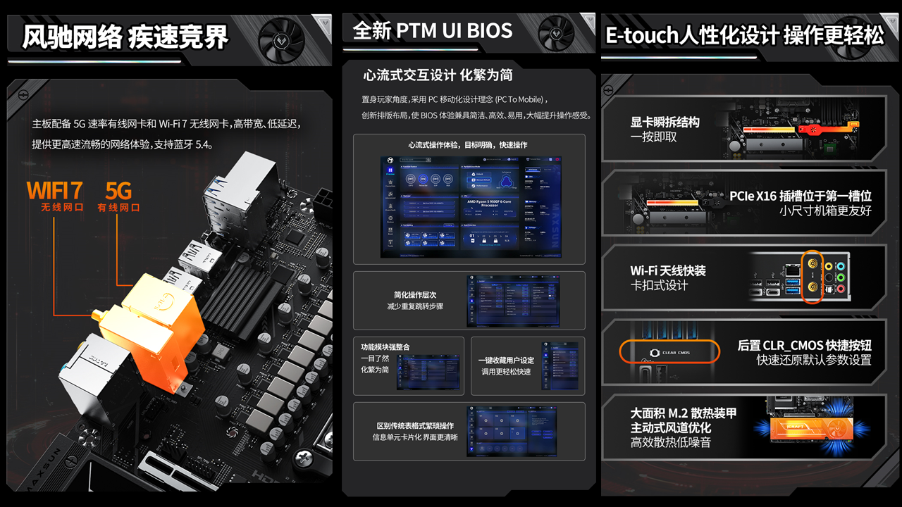 網絡體驗與操作便捷性上這款主板也毫不遜色。5G 速率有線網卡與 Wi-Fi 7 無線網卡的雙旗艦配置,搭配藍牙 5.4,無論是有線連接的穩定高速,還是無線連接的低延遲,都能高度適配在線競技、高清直播等等對網絡要求嚴苛的場景。全新升級的 PTM UI BIOS 更是一大亮點,借鑒手機 APP 交互邏輯,將功能模塊化且交互層級精簡至 2 層以內,新手也能輕松完成 BIOS 調試;顯卡瞬拆結構、Wi-Fi 天線快裝、后置 CLR_CMOS 快捷按鈕等 E-touch 人性化設計,讓裝機和調試過程告別繁瑣,省心又高效,小白也能輕松上手。